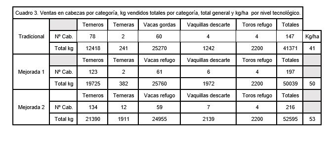 Obteniéndose los resultados físicos en cantidad de cabezas vendidas y kilogramos del cuadro 3 y figura 1 para cada nivel de tecnología en el establecimiento analizado.