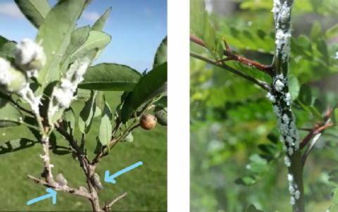 Por ello, se recomienda la revisación de apiarios, especialmente la cámara de cría para verificar el normal desarrollo de la colonia adultos de la chicharrita Epormenis cestri indicados con las flechas y sobre las hojas superiores y en foto de la derecha, ninfas con cubiertas algodonosas, típicas (formas juveniles que preceden a los adultos)