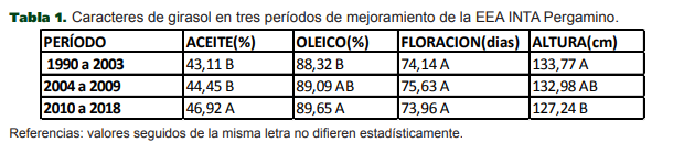 En la Tabla 1 se presentan los valores promedios de cuatro caracteres en los tres períodos analizados. Se observa que en contenido porcentual de aceite los valores más altos se obtuvieron en el período 2010-2018. En contenido de ácido oleico los períodos 2004-2009 y 2010-2018 fueron superiores a los obtenidos en 1990-2003, pero no difirieron entre si y 2010-2018 superó significativamente a 1900 a 2003. En ciclo a floración no se observaron diferencias entre los períodos. En altura los valores más bajos se dieron en 2004- 2009 y 2010-2018.