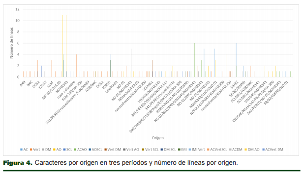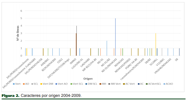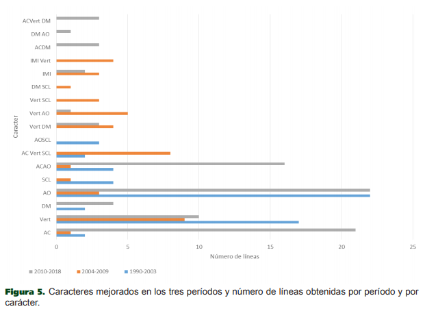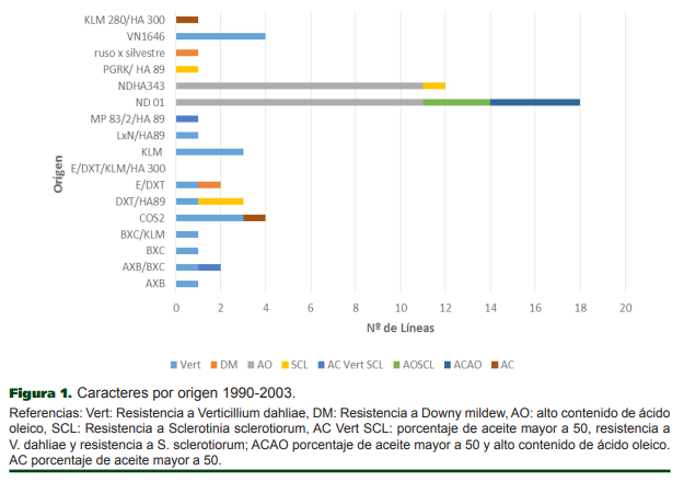 En al análisis conjunto de los tres períodos (Figs. 4 y 5) se observa que en el 1er período (1990-2003) se partió de poblaciones mejoradas de la EEA Pergamino y algunas cruzas, así como también de materiales provenientes de North Dakota. En este período se puso énfasis en la resistencia a V. dahliae y en la obtención de líneas de alto oleico, aunque también se obtuvo germoplasma con resistencia a S. sclerotiorum y Downy mildew. En el período 2004-2009, se incrementa el número de cruzas por lo cual se obtienen genotipos mejorados a partir de orígenes diversos y aumenta el número de líneas que reúnen más de un carácter mejorado y se obtuvieron también líneas con resistencia a Imidazolinonas. En el período 2010-2018 se alcanza el más alto número de líneas con caracteres mejorados obtenidas a partir del mayor número de orígenes diversos. Se mantiene la tendencia del período anterior de reunir en una misma línea dos y hasta tres caracteres destacados y se incrementa el número de líneas con alto contenido de aceite y alto contenido de ácido oleico. Analizando el aporte de las diferentes fuentes genéticas al mejoramiento de los caracteres en los tres períodos, se observa que para contenido de aceite se destacaron SB/BZ, ND01/BZ y NDHA343/LUCH/ND 01; para resistencia a V. dahliae VN1646, COS2 y KLM; para resistencia a Downy mildew SCLMILL, SCLMILL/ND 01, 341/PERED/IMIND/ND 01, E/DXT, ruso x silvestre y VN1646/NDHA343; para resistencia a S. sclerotiorum DXT/HA89. Los orígenes ND 01 y NDHA343 fueron las fuentes de alto contenido de ácido oleico e IMIND la de resistencia a Imidazolinonas.