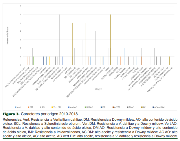 3º 2010-2018: Se mantiene la estrategia de ampliar la variabilidad genética a partir de cruzamientos entre orígenes diferentes. Se pone mayor énfasis en el objetivo de la obtención de germoplasma con alto contenido de aceite y ácido oleico con resistencia a enfermedades. Los resultados de cada período se evaluaron a través del número de líneas obtenidas con resistencia a Verticillium dahliae, resistencia a Downy mildew, resistencia a Sclerotinia sclerotiorum, alto contenido de aceite (mayor al 50 %), alto contenido de ácido oleico (mayor al 90 %) y resistencia a Imidazolinonas.