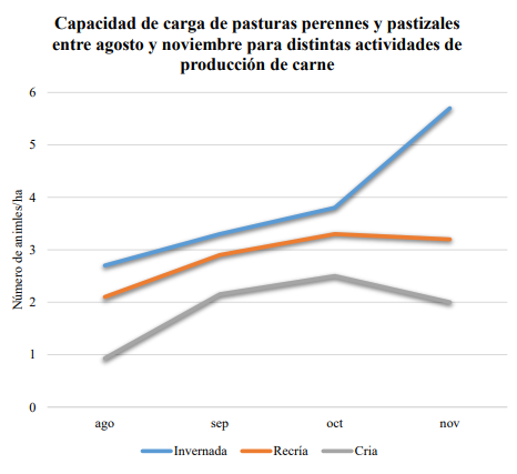Como se puede observar en el gráfico siguiente, entre agosto y octubre la capacidad de carga se incrementa 1,5 veces en cría y 0,6 veces en recría. En invernada, entre agosto y noviembre, el valor correspondiente es 1,1 veces. En términos absolutos la productividad entre agosto y noviembre representa el 58, 37 y 29 % del total anual para cría, recría y engorde, respectivamente.