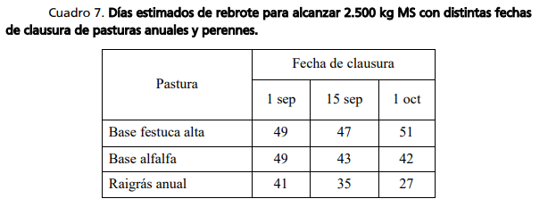 En establecimientos con escasa capacidad para absorber el crecimiento extra primaveral se deberá recurrir a la conservación de forrajes. Como una aproximación, con adecuada provisión de agua y nutrientes, según las temperaturas del norte de la provincia de Buenos Aires, los días requeridos para acumular 2.500 kg MS/ha serían entre 40 y 50 según pastura y fecha de clausura al pastoreo (Cuadro 7).