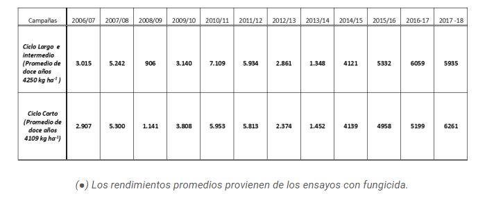 Con respecto al rendimiento posible de alcanzar en la región, es importante destacar que en las doce últimas campañas (2006/07 a 2017/18), el 67% de los rendimientos promedio fueron de buenos a muy buenos (Cuadro Nº 1), y en el 33% restante fueron de malos a regulares, principalmente por estrés hídrico de distinta severidad. El promedio de rendimiento de las doce campañas supera los 4000 kg ha-1 en ambos ciclos de precocidad.