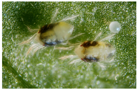 El huevo de Tetranychus urticae es translúcido y parecido a una pequeña perla.