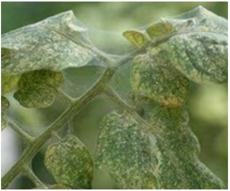 La planta atacada por arañuela roja tiene la apariencia de estar cubierta por un tul en el que se visualizan unos pequeños puntos, que son precisamente los ácaros Tetranychus urticae.