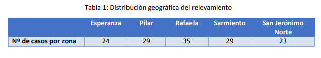El relevamiento se realizó a través de entrevistas personales realizadas por dos profesionales de la cooperativa, durante el periodo comprendido entre febrero y agosto de 2018. Se utilizó como herramienta metodológica “Analizá tu tambo” una aplicación para Excel, que permite evaluar la eficiencia global y por área de la empresa. Dicha herramienta cuenta con ocho áreas diferentes: Nivel de conocimiento de indicadores, producción de alimentos, relación con el personal, uso de la maquinaria, manejo de la alimentación, reproducción y sanidad, infraestructura y manejo empresarial. Para cada una de estas áreas el productor entrevistado debió responder seis preguntas cerradas, cuyas respuestas podían ser: SI, NO o Más o menos. Para el análisis poblacional y procesamiento de los resultados obtenidos fue utilizado el programa Infostat 2018. Se realizaron 140 entrevistas a productores de diferentes zonas de la zona del centro de la provincia de Santa Fe. En a tabla 1, se presenta la distribución geográfica y cantidad de productores entrevistados por zona.