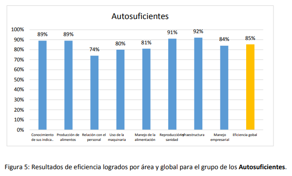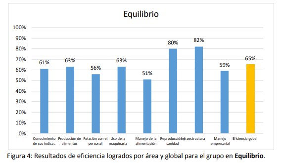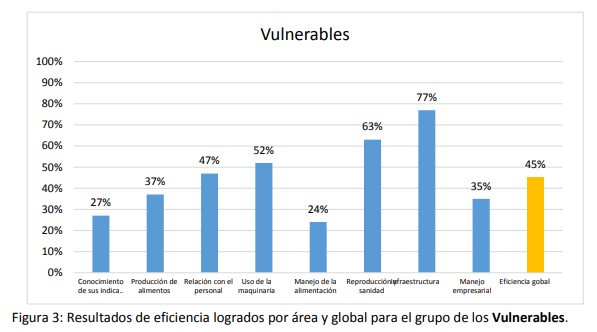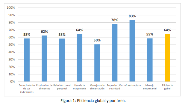 Como puede observarse en la figura anterior, las tres áreas con menor valor de eficiencia fueron: manejo de la alimentación (24%), conocimiento de sus indicadores (27 %) y el manejo empresarial (35%).