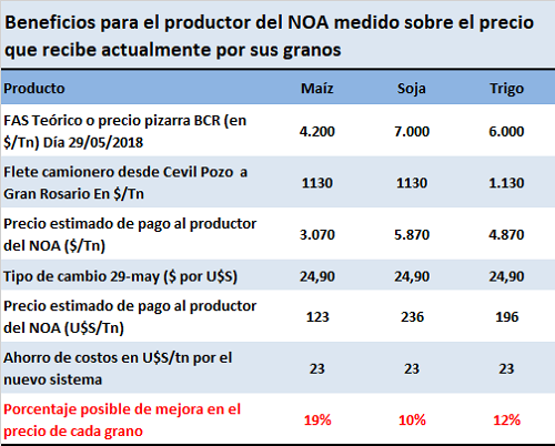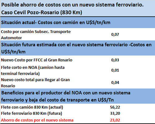 Actualizamos el caso de un productor agropecuario de una zona cercana a la ciudad de Tucumán, a 830 km del Gran Rosario. En la actualidad este productor por trasladar en camión sus granos a los puertos y fábricas del Gran Rosario abona cerca de 7 centavos de dólar la tn/km. Con el nuevo sistema ferroviario debería pagar una cifra cercana a los 4 centavos de U$S la tn/Km. Esto implicaría un ahorro de costos de flete de 23 U$S aproximadamente por cada tonelada transportada.