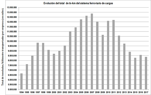 Si se analiza la evolución del sistema ferroviario de cargas de la República Argentina, medido tanto en toneladas transportadas como en toneladas-kilómetro, desde la con-cesión al sector privado en los años ’90 hasta la actualidad, se puede apreciar tres grandes etapas: una inicial de crecimiento, de alrededor de 10 años; luego un máximo con cierta estabilización de la carga transportada de unos 8 años y una de decreci-miento que llega hasta nuestros días desde el año 2007.