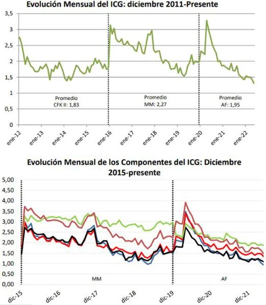 La caída del ICG en curso (mayo), desde un nivel que ya era bajo, consolida al índice por debajo de la peor medición registrada durante el gobierno de Mauricio Macri (ICG abril de 2019 = 1,53) y lo lleva al menor nivel desde el inicio de la presidencia de Alberto Fernández. Valores aún menores a estos solo registró la UTDT en junio-julio de 2008, en pleno conflicto con el campo, en la primera presidencia de Cristina Fernández de Kirchner y en la presidencia de Eduardo Duhalde.