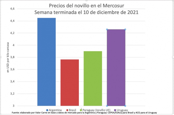 Desde la última semana, las cotizaciones en dólares del novillo en los diferentes países del Mercosur tuvieron el siguiente comportamiento.