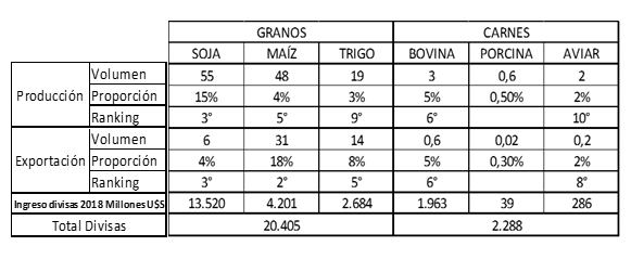 En el siguiente cuadro, se resume el volumen producido y exportado en millones de toneladas por año, para los tres granos y carnes principales. Se agrega la proporción que estos volúmenes representan, en función de la producción y exportación mundial de cada producto. Por último, se ubica a la Argentina en el ranking de producción y exportación, considerando los 10 principales productores y exportadores.