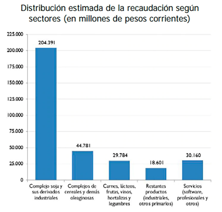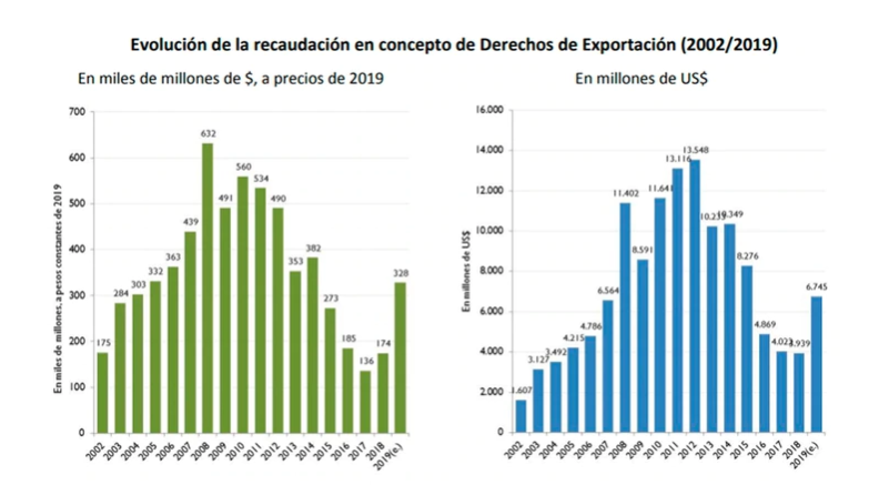 Sin embargo, según Juan Manuel Garzón, investigador del Ieral de la Fundación Mediterránea, en 2019 las retenciones ya significaron el 9,5% de la recaudación total: aportaron 328.000 millones, de los cuales 279.000 millones (85%) provinieron del campo, más de 200.000 millones de ellos del complejo de la soja y sus derivados industriales. Los complejos cerealeros (maíz, trigo y sus derivados) y oleaginoso (girasol, maní) aportaron unos 45.000 millones y otros productos del agro, como carnes, lácteos, vinos, hortalizas y legumbres, $29.800 millones. Esto es, el rubro más pequeño del agro, aportó por retenciones un pelín menos que el incipiente sector del software y servicios profesionales y 60% más que las exportaciones de la llamada “industria manufacturera”. En dólares, las retenciones aportaron durante ese período poco más de 130.000 millones, de los cuales aproximadamente 100.000 provinieron del campo.