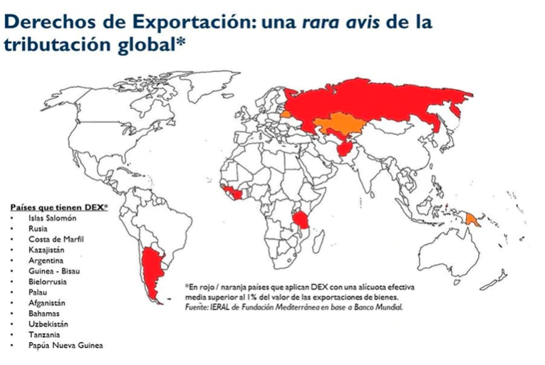 Los derechos de exportación, consagrados por el “Código Aduanero” sancionado en 1980 por la dictadura del llamado “Proceso de Reorganización Nacional”, son una rara avis a nivel mundial. La página estadística del Banco Mundial buscó información sobre 200 países y halló información sobre 96 de ellos, de los cuales en la absoluta mayoría de los casos estos derechos representan 0% o menos de 1% de la recaudación total.