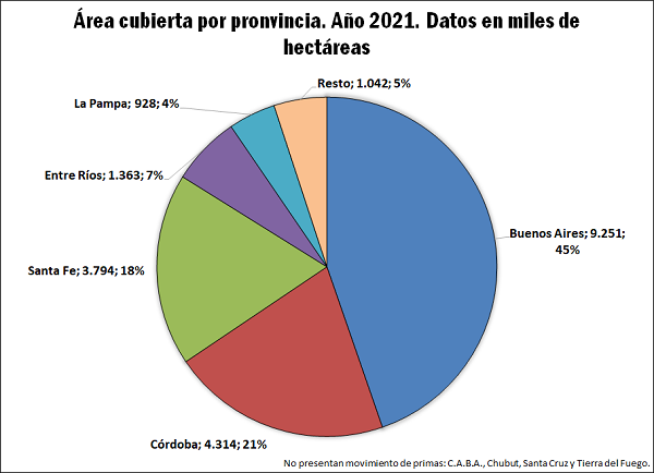 Entre las provincias sobre la cual se encuentran los lotes cubiertos, destaca Buenos Aires con 9,2 millones de hectáreas, seguida por Córdoba con 4,3 M ha y Santa Fe en tercera posición con 3,8 M ha. Entre estas tres provincias concentraron el 84% del total de área cubierta en el país. Tan solo en cuatro jurisdicciones, C.A.B.A., Tierra del Fuego, Chubut y Santa Cruz, no se registraron contrataciones de este tipo de coberturas en el año de referencia.
