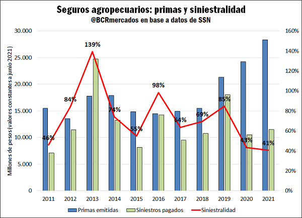 El índice de siniestralidad, que mide la relación entre los siniestros pagados por las aseguradoras y las primas emitidas por las mismas, alcanzó para el rubro de seguros agropecuarios y forestales su valor más bajo en la última década. Mientras que las primas emitidas alcanzaron $ 28.304 millones en 2021, los siniestros pagados totalizaron $ 11.486 millones, por lo que este índice alcanzó un 41% en dicho ejercicio.