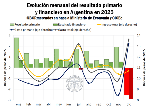 Julio registró un rojo financiero moderado pese a mantener superávit primario, debido al peso de los intereses de deuda. En diciembre, el aumento típico del gasto social y salarial llevó tanto al resultado primario como al financiero a valores negativos, aunque igualmente se trató de uno de los mejores desempeños históricos para ese mes.