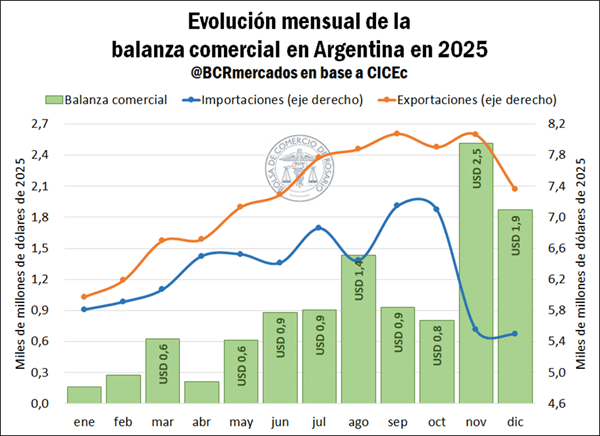 El mayor saldo mensual se registró en noviembre, con US$ 2.500 millones, impulsado por exportaciones agrícolas que se concretaron tras la eliminación temporal de retenciones y en un escenario internacional marcado por tensiones comerciales entre Estados Unidos y China, que reforzaron la demanda de productos argentinos.