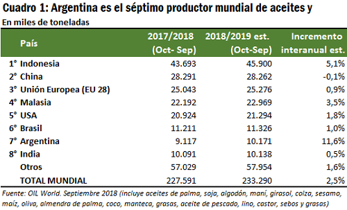 En el ciclo 2017/18 Argentina ocupó el octavo puesto en el ranking de países productores de aceites y grasas, y mejoraría su posición en la próxima campaña. La alemana Oil World estima una producción nacional superior a las 10 millones de toneladas para el ciclo 2018/19 (octubre a septiembre), con la cual superaría a la producción de India. Considerando a los ocho mayores productores de aceites a nivel global, Argentina es el país que registraría el mayor crecimiento productivo esta campaña, con un incremento interanual estimado de 11,6%.