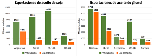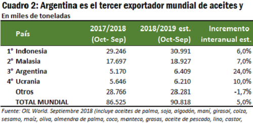 En la campaña 2018/19 Argentina mejoraría su posición en materia de exportaciones de aceites y grasas respecto del ciclo anterior, colocándose en el 3° puesto, sólo detrás de Indonesia y Malasia. Estas dos naciones asiáticas son las mayores exportadoras del aceite más consumido a nivel mundial: el aceite de palma. Gracias a un incremento interanual estimado del 24%, las exportaciones argentinas superarían a las ucranianas y alcanzarían las 6,4 millones de toneladas en 2018/19, según estimaciones de Oil World.