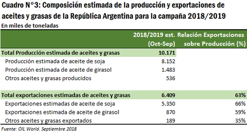 En materia de producción de grasas y aceites, en la campaña 2018/19 se espera que Argentina llegue a 10,1 millones de toneladas, produciendo 8,1 millones de toneladas de aceite de soja y 1,4 millones de toneladas de aceite de girasol. De esos 10,1 millones de toneladas, se estarían exportando en el ciclo cerca de 6,4 millones, entre ellos, 5,3 Mt de aceite de soja y 870.000 toneladas de aceite de girasol.