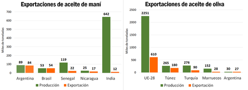 A pesar de tratarse de mercados menos voluminosos, vale la pena destacar que Argentina es líder en exportación de aceite de maní (84.000 toneladas en 2017/18) y es el cuarto exportador mundial de aceite de oliva (30.000 toneladas). La oferta argentina de aceite de maní representa el 44% del volumen total comercializado a nivel mundial y, como el resto de los productos derivados del maní argentino, es reconocido mundialmente por su alta calidad. El principal destino de las exportaciones de aceite nacional es el mercado chino, que además concentra el 50% del mercado global de aceite de maní bruto. La provincia argentina productora de maní por excelencia es Córdoba, donde esta actividad regional desarrolló una eficiente cadena que comprende la producción, la industrialización y la exportación de los productos derivados del maní.