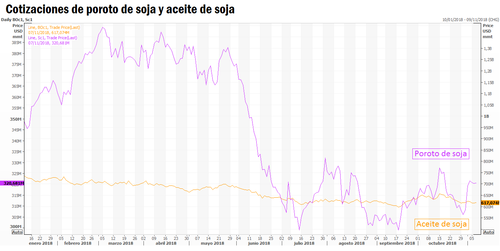 Sin embargo, en el caso particular del mercado de aceite de soja, tienen mayor peso los sucesos políticos que actualmente condicionan el comercio internacional que cuestiones puramente económicas. La disputa arancelaria entre Estados Unidos y China es la principal causa detrás de la gran volatilidad del precio de la soja y sus derivados en el mercado de Chicago.