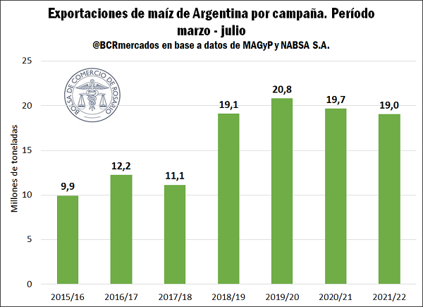 A nivel local, el nivel de exportaciones argentina de maíz en los datos preliminares para la muestran que hasta julio, es decir, en el primer cuatrimestre de la campaña 2021/22, se han registrado ventas externas por 19 millones de toneladas, lo cual se encuentra por debajo de los tres ciclos anteriores.