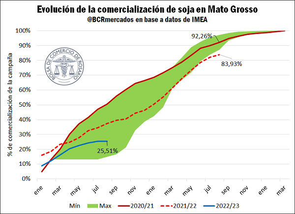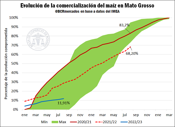 De acuerdo con los datos presentados por el Instituto Matogrosense de Economía Agropecuaria, el maíz ha alcanzado el equivalente al 68,2% de la producción de la cosecha 2021/22, encontrándose 15 puntos porcentuales por detrás de lo sucedido en la campaña previa. No obstante, debe tenerse en cuenta el fuerte incremento productivo que se registró entre años, favoreciendo al actual ciclo comercial, por lo cual, el tonelaje absoluto negociado se encuentra un 1% por debajo del volumen del año anterior. Por otra parte, el ciclo 2022/23 también mantiene un retraso frente a la comercialización del maíz en términos relativos, alcanzando actualmente al 11,9% de la próxima cosecha cuando un año atrás se había comerciado el 28,7% de la actual safra.