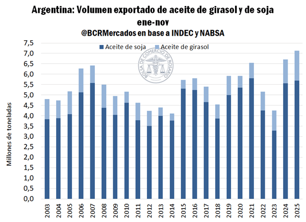 Con el 2025 a un mes de cerrar, Argentina consolida su liderazgo mundial en el comercio de aceites vegetales. Entre enero y noviembre, los embarques de aceite de soja y girasol alcanzaron un máximo histórico de 7,12 millones de toneladas, traccionados por la creciente demanda de India y por un mercado internacional condicionado por problemas productivos en el Mar Negro y el avance de los biocombustibles.