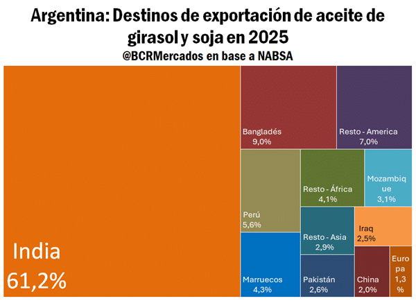 El gigante asiático se consolidó como el principal destino de los aceites argentinos. En 2025 absorbió 61,2% de los embarques totales, alcanzando 3,89 Mt hasta noviembre, un volumen 50% superior al promedio de los últimos cinco años. La mayor demanda se explica por el crecimiento poblacional, la diversificación de su dieta alimentaria y la necesidad de sustituir aceite de palma, cuyo abastecimiento global se redujo por las políticas de biocombustibles de Indonesia.