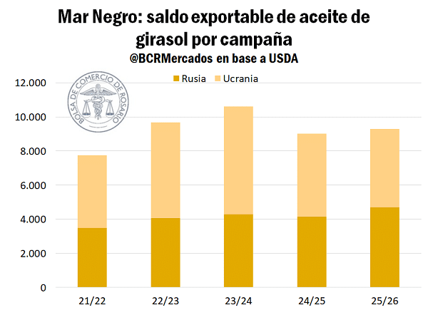 En el Mar Negro —región que explica el 70% de las exportaciones mundiales de aceite de girasol— Ucrania volvió a sufrir mermas productivas por el conflicto bélico y el clima adverso, acumulando dos campañas consecutivas de caída. Rusia, en cambio, registró una cosecha histórica de 18,5 Mt, aunque con elevado consumo interno que limita su saldo exportable.