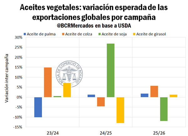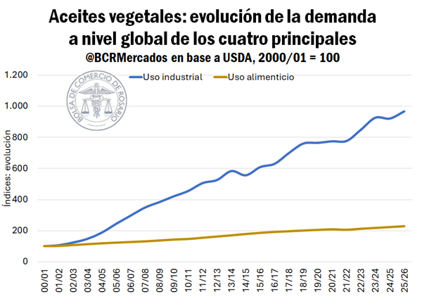 Por el lado de la demanda, el uso industrial de aceites vegetales sigue escalando. A comienzos de siglo representaba el 8% del consumo global; hoy ronda el 30%, empujado por los programas nacionales de biodiésel. Indonesia, por ejemplo, elevó en 2025 su tasa de mezcla al 40% y planea subir al 50% en 2026, reduciendo su disponibilidad exportable de aceite de palma.