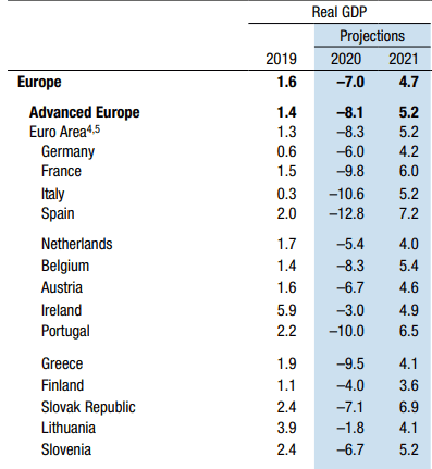 Italia, otro de los grandes afectados, caerá 10,6% según la perspectiva del Fondo, mientras que Portugal perdería un 10%. Francia retrocedería un 9,8% y Alemania, bastante menos, un 6%. El PBI de Bélgica se contraería 8,3%, mientras que el de Países Bajos lo haría en 5,4%.