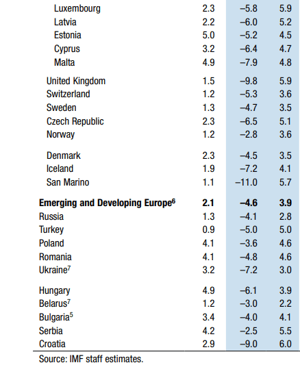 Además, la media de otras economías emergentes más pequeñas arroja una caída de 1,7% y una recuperación de 7,8%, según el Fondo.