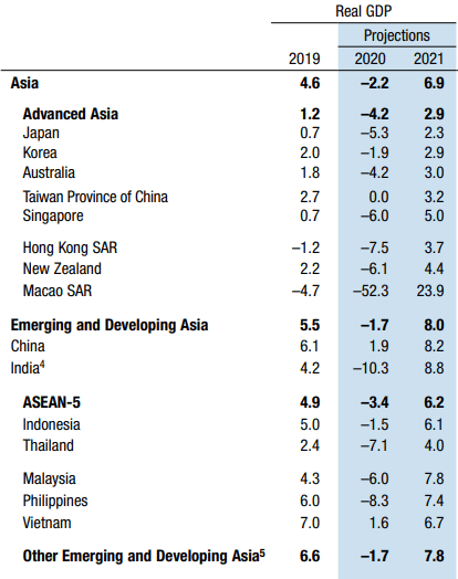 China crecería 1,9% este año y 8,9% en 2021, mientras que India se desplomaría 10,3% y se recuperaría 8,8% el año que viene. Pero el sudeste asiático aportaría otro gran impulso, dado que las cinco naciones de ASEAN (Indonesia, Filipinas, Malasia, Tailandia y Vietnam) en promedio perdería un 3,4% y rebotaría un 6,2%.