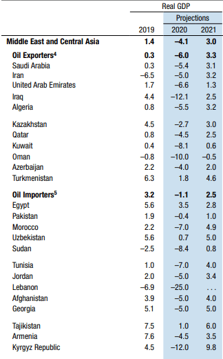 Los importadores de crudo parecen tener mejores perspectivas, con Egipto a la cabeza, que para el Fondo avanzará 3,5% en 2020 y un 2,8% en 2021. El resto, casi todos caerán 5% o menos, salvo Líbano por la crisis humanitaria que atraviesa, y otras naciones con mayores carencias.