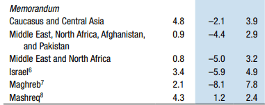 La otra región seccionadas por el FMI está compuesta por países del oeste y centro de Asia y del norte de África, y muestran en promedio un retroceso de 4,3% y una recuperación de 3%, con un fuerte impacto en los exportadores de petróleo, uno de los commodities más afectados por la pandemia.