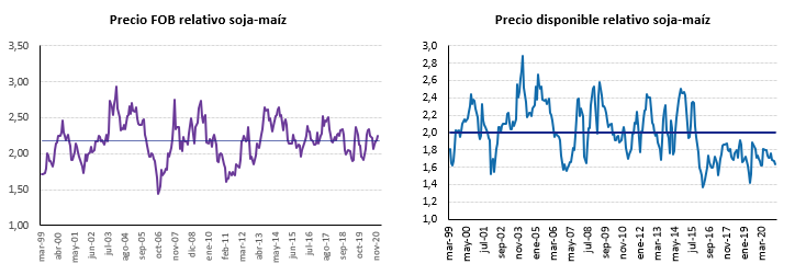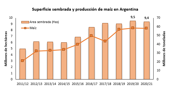 Uno de los cultivos más importantes en la producción agrícola argentina y con mayor diversidad de usos es el maíz. Se puede observar que desde la campaña 2014/15, el área sembrada del cereal se incrementó considerablemente hasta la campaña 2017/18, a partir de allí dicha variable ha presentado un comportamiento relativamente constante, entre 9,0 y 9,4 millones de hectáreas sembradas. La mayor superficie de maíz obedece a precios a nivel local relativamente más atractivos que los de la oleaginosa como consecuencia de los derechos de exportación vigentes.