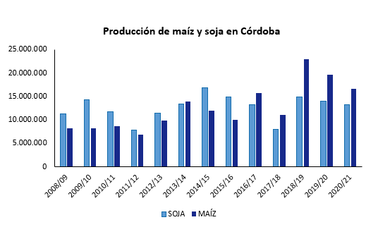 Por su parte, tal como se observa en el siguiente gráfico, cabe destacar que la provincia de Córdoba, desde la campaña 2016/17, viene reflejando una producción de maíz superior a la de soja. Para la campaña 2020/21, la producción de soja se ubica en las 13,2 millones de toneladas mientras que la de maíz sería de 16,7 millones de toneladas, es decir 3,5 millones de toneladas por encima de la oleaginosa.