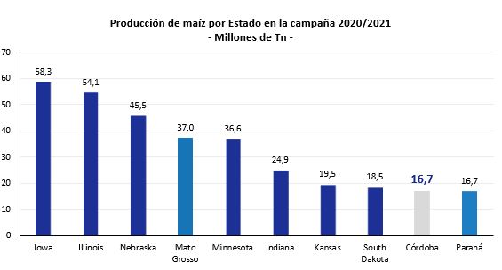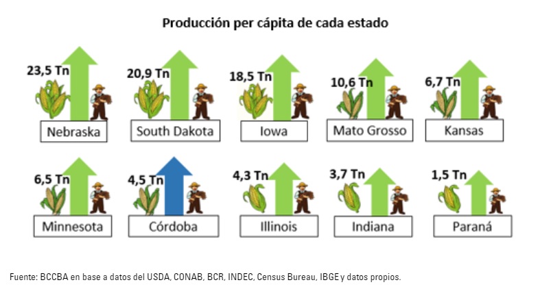 Si bien la producción de los estados del país norteamericano está menos concentrada, los mismos producen una cantidad ampliamente superior a las divisiones de los demás países. El primer puesto en el ranking de producción lo ocupa Iowa con 58,3 millones de toneladas seguido por Illinois, Nebraska y Minnesota. Estos 4 estados producen conjuntamente 136 millones de toneladas, más de 2 veces el volumen total de la producción argentina. Adicionalmente, estos estados que manejan volúmenes tan elevados, como Iowa o Nebraska, tienen una producción entre 18 y 25 toneladas por habitante, mientras que la producción per cápita cordobesa es de 4,5 toneladas. Mientras más baja sea la producción por habitante, menor la capacidad exportadora de la división ya que el consumo dentro de la provincia podría ser significativo, aunque depende en última instancia de cuánto maíz se consume geográficamente. Córdoba presenta una buena producción por habitante, ubicándose en el sexto puesto dentro del ranking de producción per cápita.