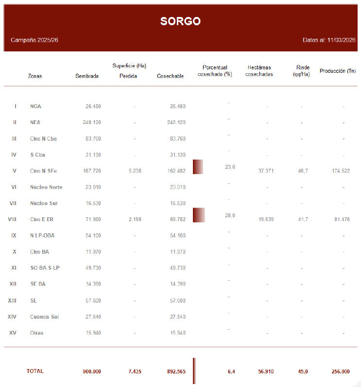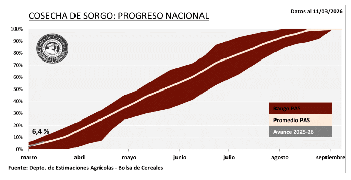 La cosecha de sorgo granífero en Argentina comienza a tomar ritmo y ya alcanza el 6,4% del área nacional estimada, con los primeros trabajos de recolección concentrados en el Centro-Norte de Santa Fe y el Centro-Este de Entre Ríos.