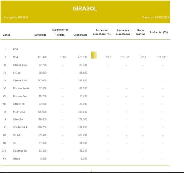La cosecha de girasol comenzó a tomar ritmo en el norte argentino y deja señales muy alentadoras, especialmente en la región del NEA, donde los primeros lotes recolectados están entregando rendimientos muy superiores a los promedios históricos. El buen comportamiento del cultivo, apalancado en un excelente estado hídrico, permite sostener sin cambios las proyecciones de producción a nivel nacional.