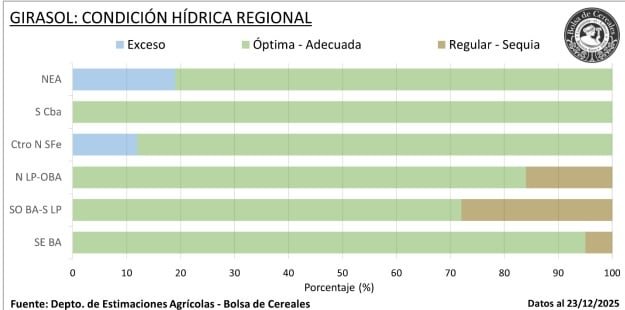 Desde el punto de vista fenológico, el 72,7 % del girasol ya transita estadios desde Botón Floral en adelante, una fase de elevada demanda hídrica que, por el momento, se encuentra correctamente abastecida. Este escenario refuerza las expectativas de una campaña que podría superar los registros recientes, especialmente en las regiones más tempranas de cosecha.