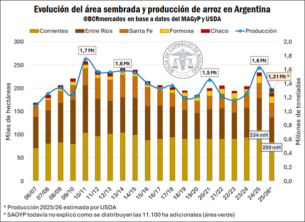 Con el inicio de la cosecha en Corrientes, la campaña arrocera 2025/26 muestra un cambio de escenario respecto del ciclo anterior. El área sembrada se redujo a unas 200.000 hectáreas, lo que implica una caída interanual del 14% frente al fuerte impulso registrado en 2024/25, cuando los precios internacionales excepcionalmente altos llevaron la superficie a 234.000 hectáreas.
