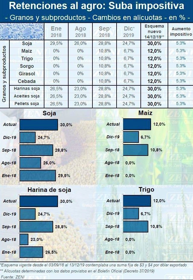 El Gobierno decidió aumentar las retenciones a las exportaciones. Lo hizo a través del Decreto 37/2019, que fue publicado este sábado en el Boletín. Las exportaciones venían pagando hasta hoy una retención ya por cada dólar facturado al exterior. En líneas generales, esa retención era de $ 3 para productos industriales y de $ 4 para las exportaciones del campo. La norma elimina ese límite y establece una alícuota del 9% para todas las ventas al exterior. Con esta decisión quedan cuatro tipos de alícuotas