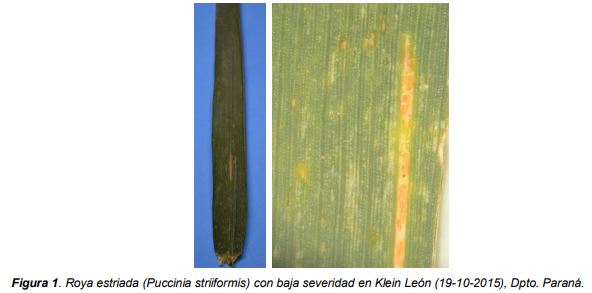Las primeras epifitias de roya estriada (RE) o amarilla del trigo causada por Puccinia striiformis f. sp. tritici en Argentina ocurrieron en 1928 y 1930. En la provincia de Entre Ríos, la primera detección en lotes de producción, ocurrió en octubre de 2010. Los cultivares afectados con relativa intensidad fueron Klein Tauro y AGP Buck Fast en Viale y Hasenkamp (Dpto. Paraná), Maciá (Dpto. Tala) y Perdices (Dpto. Gualeguaychú). En 2015, se registró nuevamente solo en la hoja bandera (HB) de pocas plantas de un cultivo de Klein León, en cercanías de la EEA Paraná (Camino del Medio) (Figura 1).