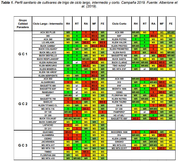 Cuando se informan los perfiles sanitarios de los cultivares de trigo, es importante revisar en primer lugar, los resultados locales (https://inta.gob.ar/documentos/evaluacion-de-cultivares-de-trigo-enentre-rios-subregion-iii-ciclo-agricola-2020); en segundo lugar, los presentados en forma conjunta por varias experimentales del INTA (Tabla 1) y por último, la tabla originada en la EEA Bordenave (https://inta.gob.ar/sites/default/files/inta_royastrigo19_act20_campos.pdf), para las tres royas del trigo. Existen cultivares adaptados a Entre Ríos (Subregión triguera III), de aceptable rendimiento de granos y buen comportamiento a RE.