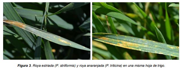 Existen cultivares que son susceptibles a más de una especie de roya y es posible observarlas juntas, incrementando la disfuncionalidad del área foliar (Figura 3).